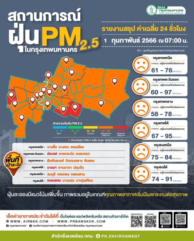 กรุงเทพมหานคร รายงานสภาพอากาศ ช่วงเช้าวันนี้ (1 ก.พ.66) ว่า ศูนย์ข้อมูลคุณภาพอากาศกรุงเทพมหานคร ขอสรุปผลการตรวจวัด PM 2.5 วันที่ 1 ก.พ.66 เวลา 05.00-07.00 น. (3 ชั่วโมงล่าสุด)