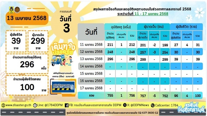 สำหรับข้อมูลอุบัติเหตุทางถนนช่วงเทศกาลสงกรานต์ พ.ศ. 2568 ประจำวันที่ 13 เมษายน 2568 ซึ่งเป็นวันที่สามของการรณรงค์ “ขับขี่ปลอดภัย เมืองไทยไร้อุบัติเหตุ” ศูนย์อำนวยการป้องกันและลดอุบัติเหตุทางถนนช่วงเทศกาลสงกรานต์ พ.ศ. 2568 โดยกรมป้องกันและบรรเทาสาธารณภัยและความร่วมมือของหน่วยงานภาคีเครือข่ายได้รวบรวมสถิติอุบัติเหตุทางถนนประจำวันที่ 13 เมษายน 2568 เกิดอุบัติเหตุ 296 ครั้ง ผู้บาดเจ็บ 299 คน ผู้เสียชีวิต 39 ราย สาเหตุที่ทำให้เกิดอุบัติเหตุสูงสุด ได้แก่ ขับรถเร็ว ร้อยละ 44.26 ดื่มแล้วขับ 29.05 และตัดหน้ากระชั้นชิด 17.91