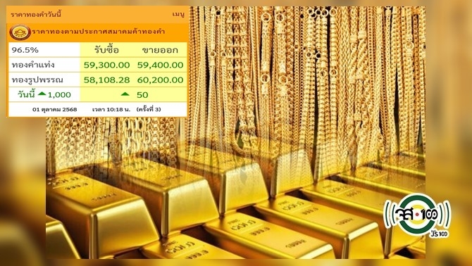 ราคาทองประจำวันนี้ (1 ต.ค. 2568) พุ่งขึ้น 950 บาท เปรียบเทียบกับราคาปิดเมื่อวานนี้ โดยราคาขายออกทองรูปพรรณ อยู่ที่ 60,150 บาท ตามข้อมูลล่าสุด จากเว็บไซต์ของสมาคมค้าทองคำ เมื่อเวลา 11.30 น.ประกาศครั้งที่ 4