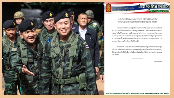 กองทัพภาคที่ 1 ศูนย์ปฏิบัติการกองทัพภาคที่ 1 สรุปสถานการณ์ประจำวันที่ 6 ต.ค.68 สืบเนื่องจากกองทัพภาคที่ 1 ขอให้ภูมิภาคทหารที่ 5 จัดทำแผนอพยพประชาชนชาวกัมพูชา ในพื้นที่บ้านหนองจาน และบ้านหนองหญ้าแก้ว อ.โคกสูง จ.สระแก้ว และบ้านคลองแผง อ.ตาพระยา จ.สระแก้ว รวม 3 พื้นที่ ก่อนจะเข้าสู่การประชุม RBC ตามคำเชิญของภูมิภาคทหารที่ 5 ของกัมพูชานั้น โดยได้รับหนังสือตอบกลับเมื่อ 5 ต.ค.68 ที่ผ่านมา ว่าทางภูมิภาคทหารที่ 5 ไม่สามารถดำเนินการตามที่กองทัพภาคทหารที่ 1 ได้เสนอไป