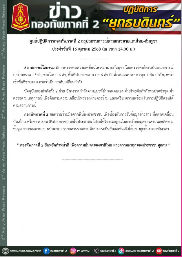 ศูนย์ปฏิบัติการกองทัพภาคที่ 2 สรุปสถานการณ์ตามแนวชายแดนไทย-กัมพูชา ประจำวันที่ 16 ตุลาคม 2568 สถานการณ์โดยรวมพบความเคลื่อนไหวของฝ่ายกัมพูชา โดยตรวจพบโดรนบินตรวจการณ์ อ.บ้านกรวด 13 ลำ, ช่องโอบก 6 ลำ, พื้นที่ปราสาทตาควาย 6 ลำ อีกทั้งตรวจพบรถบรรทุก 1 คัน กำลังมุ่งหน้าเข้าพื้นที่ชายแดน คาดว่าเป็นการสับเปลี่ยนกำลัง