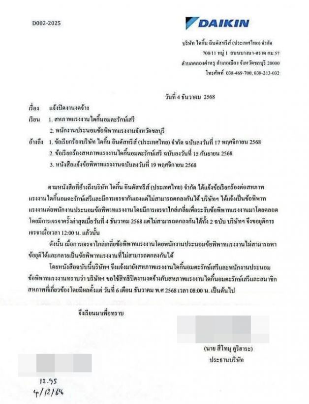 (4 ธ.ค. 68) โซเชียลมีเดียมีการเผยแพร่ และส่งต่อเอกสาร ลงวันที่ 4 ธ.ค. 68 เรื่อง แจ้งปิดงานงดจ้าง ออกโดยบริษัท ไดกิ้น อินดัสทรีย์ ประเทศไทย ส่งถึงสหภาพแรงงานไดกิ้นอมตะรัตนรังษี และพนักงานประนอมข้อพิพาทแรงงานจังหวัดชลบุรี โดยระบุถึง กรณีข้อเรียกร้องของสหภาพแรงงานไดกิ้นอมตะรัตนรังษี และการเจรจากันประนอมข้อพิพาทแรงงาน ซึ่งมีการเจรจาไกล่เกลี่ยเพื่อระงับข้อพิพาทแรงงานมาโดยตลอด ครั้งล่าสุดคือวันที่ 4 ธ.ค. แต่ไม่สามารถตกลงกันได้ บริษัทฯ จึงขอยุติการเจรจา และทางบริษัทฯ ขอใช้สิทธิปิดงานงดจ้างกับสหภาพแรงงานไดกิ้นอมตะรัตนรังษี และสมาชิกสหภาพที่เกี่ยวข้อง มีผลตั้งแต่ วันที่ 6 เดือน ธ.ค. พ.ศ. 2568 เวลา 08.00 น. เป็นต้นไป