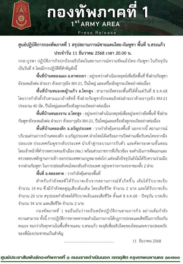 ศูนย์ปฏิบัติการกองทัพภาคที่ 1 สรุปสถานการณ์ชายแดนไทย-กัมพูชา พื้นที่ จ.สระแก้ว ประจำวัน 11 ธันวาคม 2568 เวลา 20.00 น.