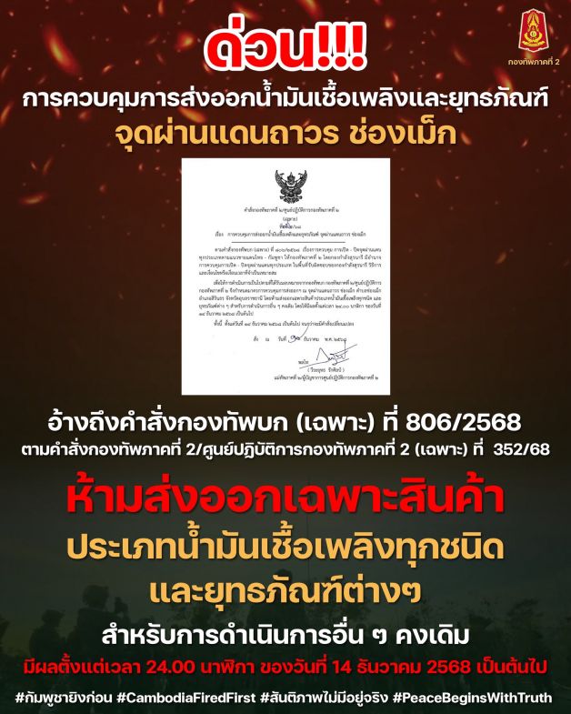 ศูนย์ปฏิบัติการกองทัพภาคที่ 2 สรุปสถานการณ์ตามแนวชายแดนไทย-กัมพูชา ประจำวันที่ 14 ธันวาคม 2568 (เวลา 18.00 น.) สถานการณ์ ในวันนี้ตั้งแต่เวลา 09.00 น. เป็นต้นมา มีเหตุการณ์ที่สำคัญดังนี้