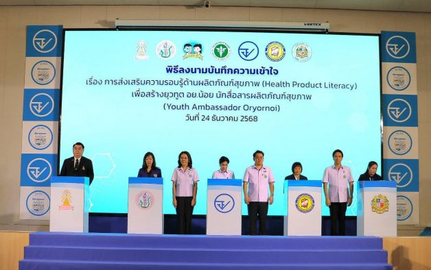 วันนี้ (24 ธันวาคม 2568) ที่ห้องประชุมชั้น 10 อาคารศูนย์บริการผลิตภัณฑ์สุขภาพเบ็ดเสร็จ (OSSC) สำนักงานคณะกรรมการอาหารและยา (อย.) นายพัฒนา พร้อมพัฒน์ รัฐมนตรีว่าการกระทรวงสาธารณสุข เป็นประธานแถลงข่าวเปิดตัวกิจกรรม ยุวทูต อย.น้อย (Youth Ambassador Oryornoi) พร้อมเป็นพยานพิธีลงนามบันทึกข้อตกลงความร่วมมือ (MOU) เรื่อง การส่งเสริมความรอบรู้ด้านผลิตภัณฑ์สุขภาพ (Health Product Literacy) เพื่อสร้างยุวทูต อย.น้อย นักสื่อสารผลิตภัณฑ์สุขภาพ ระหว่าง อย. กับสถานศึกษา 4 แห่ง ได้แก่ โรงเรียนเตรียมอุดมศึกษา โรงเรียนสาธิตแห่งมหาวิทยาลัยเกษตรศาสตร์ โรงเรียนเซนต์โยเซฟคอนเวนต์ และโรงเรียนเซนต์คาเบรียล รวมถึงมอบใบประกาศนียบัตรโรงเรียนนำร่องยุวทูต อย.น้อย ในเขตกรุงเทพมหานคร ให้ทั้ง 4 โรงเรียน และสมาคมผู้ปกครองและครูโรงเรียนเตรียมอุดมศึกษา โดยมีนายฐิติวัสส์ ศรีก๊กเจริญ ตัวแทนยุวทูต อย. น้อย โรงเรียนเตรียมอุดมศึกษา เป็นผู้กล่าวรายงาน
