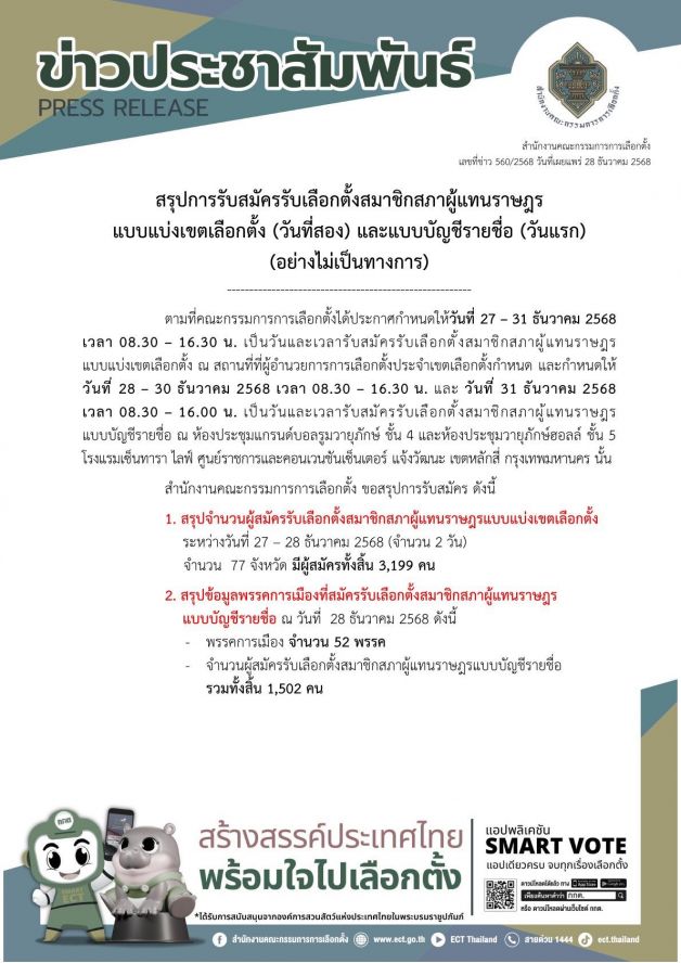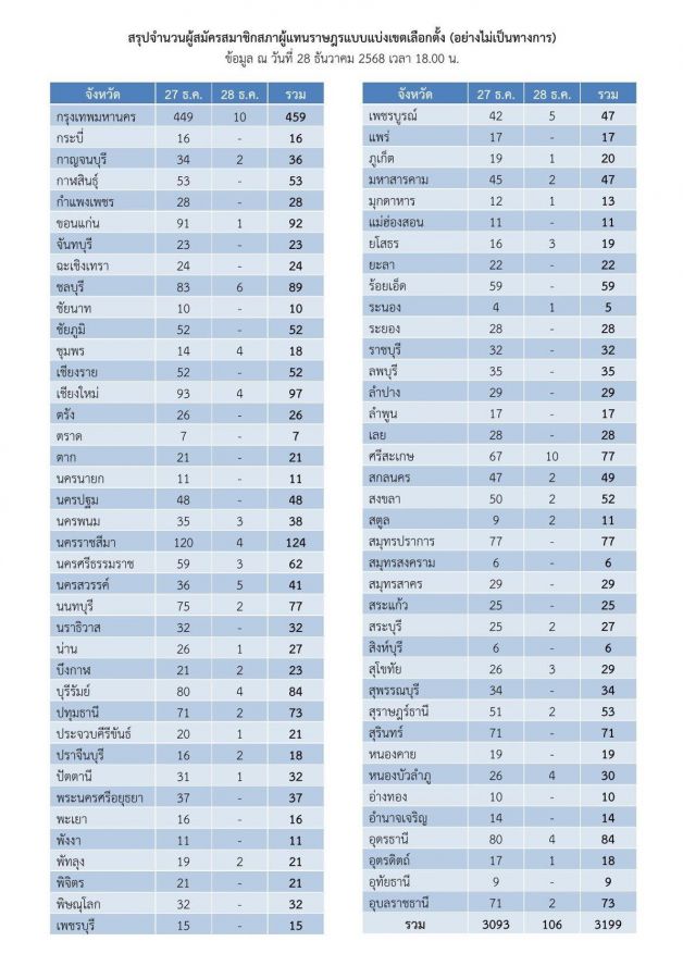 (28 ธ.ค.68) สำนักงานคณะกรรมการการเลือกตั้ง สรุปการรับสมัครรับเลือกตั้งสมาชิกสภาผู้แทนราษฎรแบบแบ่งเขตเลือกตั้ง (วันที่สอง) และแบบบัญชีรายชื่อ (วันแรก) (อย่างไม่เป็นทางการ)