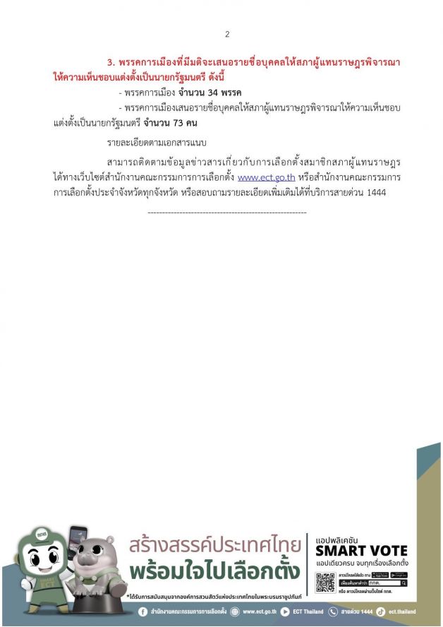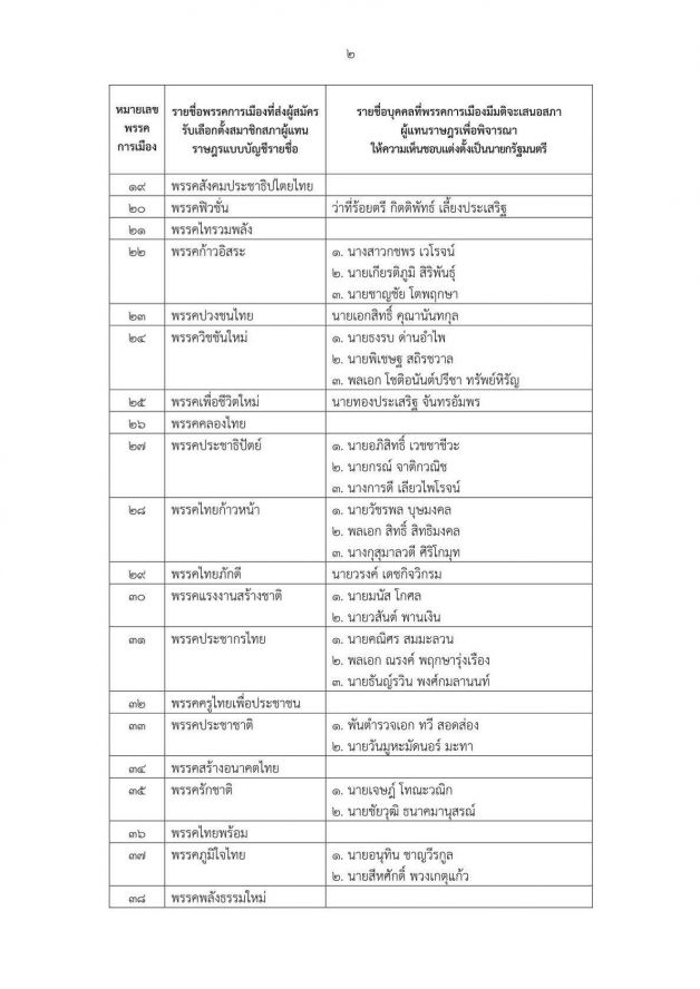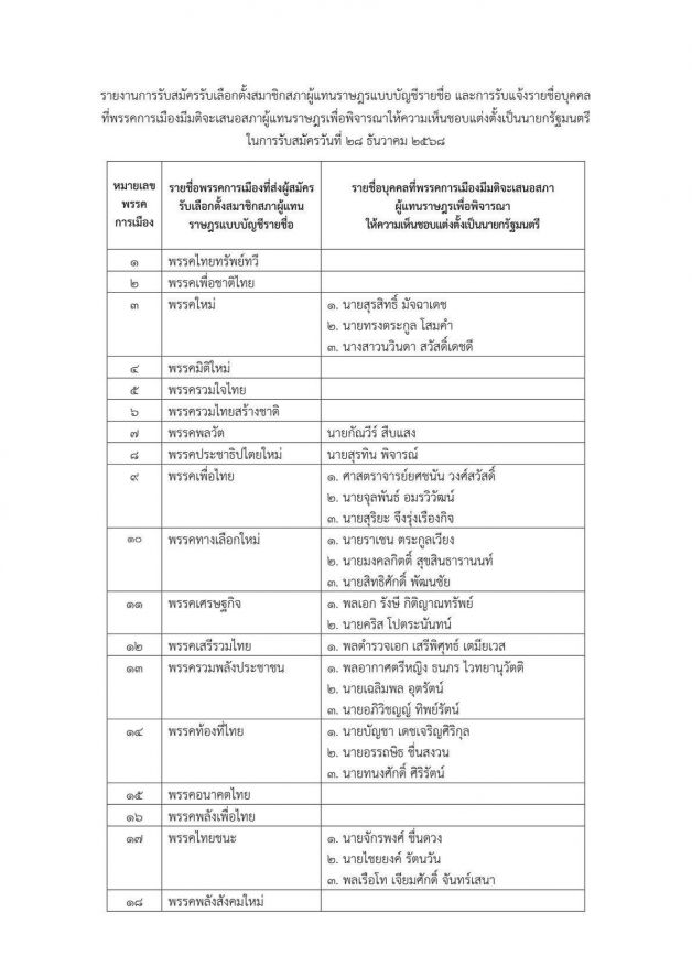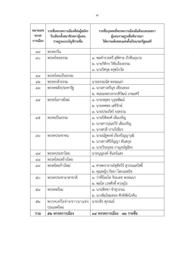 - พรรคการเมืองเสนอรายชื่อบุคคลให้สภาผู้แทนราษฎรพิจารณาให้ความเห็นชอบแต่งตั้งเป็นนายกรัฐมนตรี จำนวน 73 คน