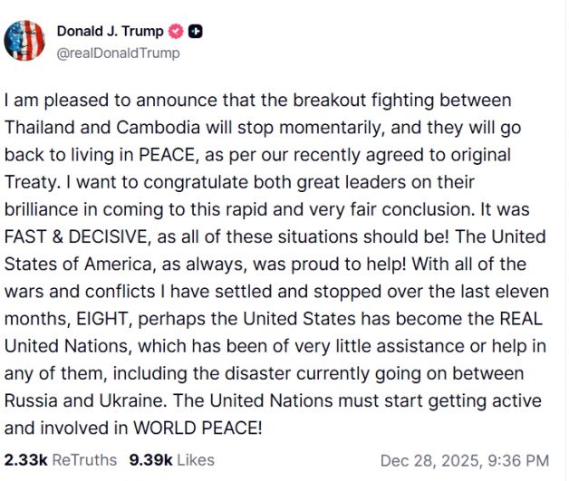 ประธานาธิบดีโดนัลด์ ทรัมป์ ผู้นำสหรัฐฯ โพสต์ข้อความบนทรูธ โซเชียล แสดงความยินดีที่มีการประกาศหยุดยิงระหว่างไทยกับกัมพูชา โดยระบุว่า มีความยินดีที่จะประกาศว่า การสู้รบระหว่างไทยและกัมพูชาจะยุติลง และทั้งสองประเทศจะกลับไปใช้ชีวิตอย่างสงบสุข ตามข้อตกลงเดิมที่มีความเห็นชอบร่วมกัน ขอแสดงความยินดีกับผู้นำที่ยิ่งใหญ่ทั้ง 2 สำหรับความชาญฉลาดในการบรรลุข้อสรุปที่รวดเร็วและยุติธรรม ซึ่งเป็นไปอย่างรวดเร็วและเด็ดขาดอย่างที่ควรจะเป็น สหรัฐอเมริกามีความภูมิใจที่ได้ช่วยเหลือ พร้อมระบุด้วยว่า ด้วยสงครามและความขัดแย้งทั้งหมดที่ได้เข้าไปจัดการและยุติลงในช่วง 11 เดือนที่ผ่านมา มีอยู่ถึง 8 แห่ง บางทีสหรัฐอเมริกาได้กลายเป็นสหประชาชาติที่แท้จริง ซึ่งที่ผ่านมาสหประชาชาติได้ให้ความช่วยเหลือเพียงเล็กน้อยในทุกเหตุการณ์ รวมถึงกรณีระหว่างรัสเซียและยูเครน ซึ่งประธานาธิบดีทรัมป์ เรียกร้องให้ สหประชาชาติมีส่วนร่วมในสันติภาพโลกมากกว่าเดิม