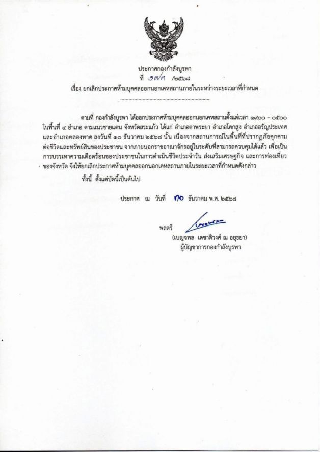 กองกำลังบูรพา กองทัพภาคที่ 1 ยกเลิกประกาศห้ามบุคคลออกนอกเคหสถานภายในระหว่างระยะเวลาที่กำหนด ตามที่ กองกำลังบูรพา ได้ออกประกาศห้ามบุคคลออกนอกเคหสถานตั้งแต่เวลา 19.00 น. - 05.00 น. ในพื้นที่อำเภอ ตามแนวชายแดน จังหวัดสระแก้ว ได้แก่ อำเภอตาพระยา อำเภอโคกสูง อำเภออรัญประเทศ และอำเภอคลองหาด ลงวันที่ 10 ธันวาคม 2568 นั้น