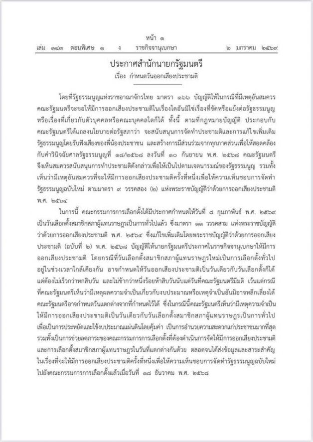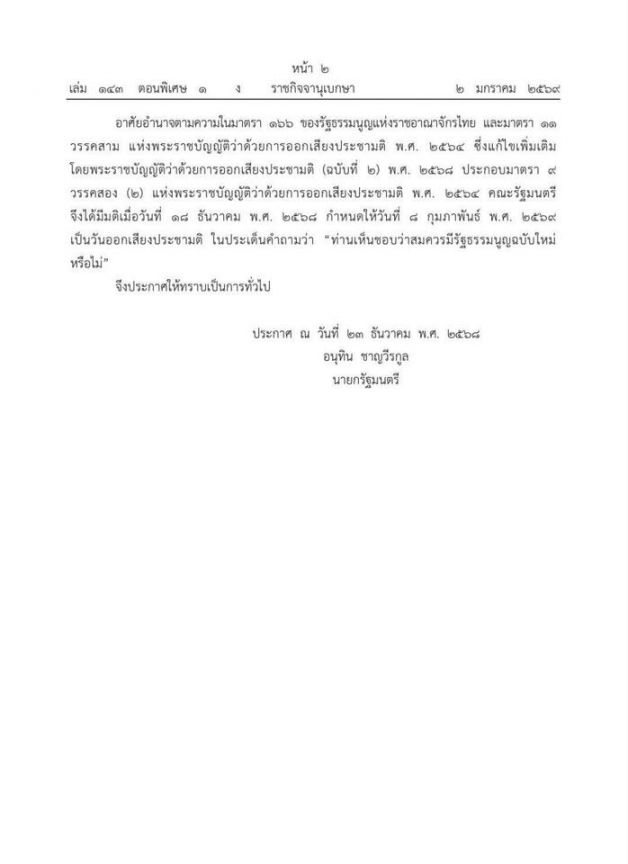 เว็บไซต์ราชกิจจานุเบกษาเผยแพร่ประกาศสำนักนายกรัฐมนตรี เรื่อง กำหนดวันออกเสียงประชามติ ลงนามโดยนายอนุทิน ชาญวีรกูล นายกรัฐมนตรี กำหนดให้เป็นวันเดียวกันกับวันเลือกตั้งสมาชิกสภาผู้แทนราษฎร (สส.) เป็นการทั่วไปในวันที่ 8 ก.พ.69 โดยระบุว่า