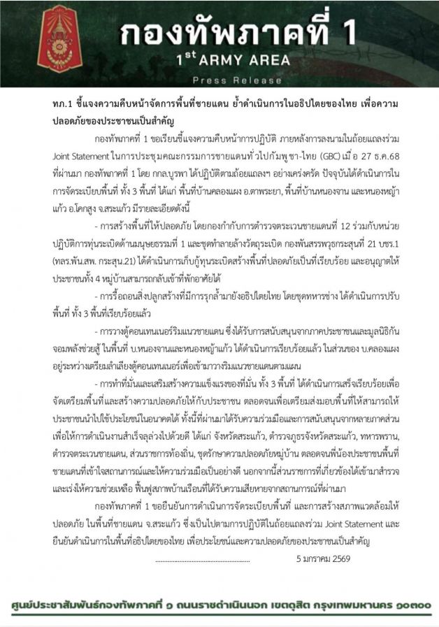 เฟซบุ๊กกองทัพภาคที่ 1 ชี้แจงความคืบหน้าการปฏิบัติ ภายหลังการลงนามในถ้อยแถลงร่วม Joint Statement ในการประชุมคณะกรรมการชายแดนทั่วไปกัมพูชา-ไทย (GBC) เมื่อ 27 ธ.ค.68 ที่ผ่านมา กองทัพภาคที่ 1 โดย กกล.บูรพา ได้ปฏิบัติตามถ้อยแถลงฯ อย่างเคร่งครัด ปัจจุบันได้ดำเนินการในการจัดระเบียบพื้นที่ ทั้ง 3 พื้นที่ ได้แก่ พื้นที่บ้านคลองแผง อ.ตาพระยา, พื้นที่บ้านหนองจาน และหนองหญ้าแก้ว อ.โคกสูง จ.สระแก้ว มีรายละเอียดดังนี้