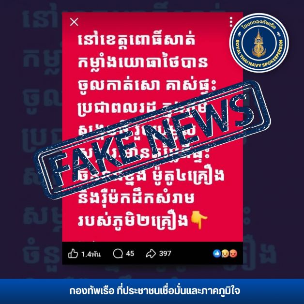 พลเรือตรี ปารัช รัตนไชยพันธ์ โฆษกกองทัพเรือ เปิดเผยว่า ตามที่มีการเผยแพร่ข้อมูลและข่าวสารทางสื่อสังคมออนไลน์ซึ่งอาจก่อให้เกิดความเข้าใจว่า กำลังพลของกองทัพเรือภายหลังการยึดคืนพื้นที่ ได้มีการนำทรัพย์สินมีค่าของทหารหรือประชาชนชาวกัมพูชาไปเป็นของตนเองนั้น สำนักงานโฆษกกองทัพเรือขอเรียนชี้แจงต่อประชาชนชาวกัมพูชาว่า ไม่เป็นความจริง