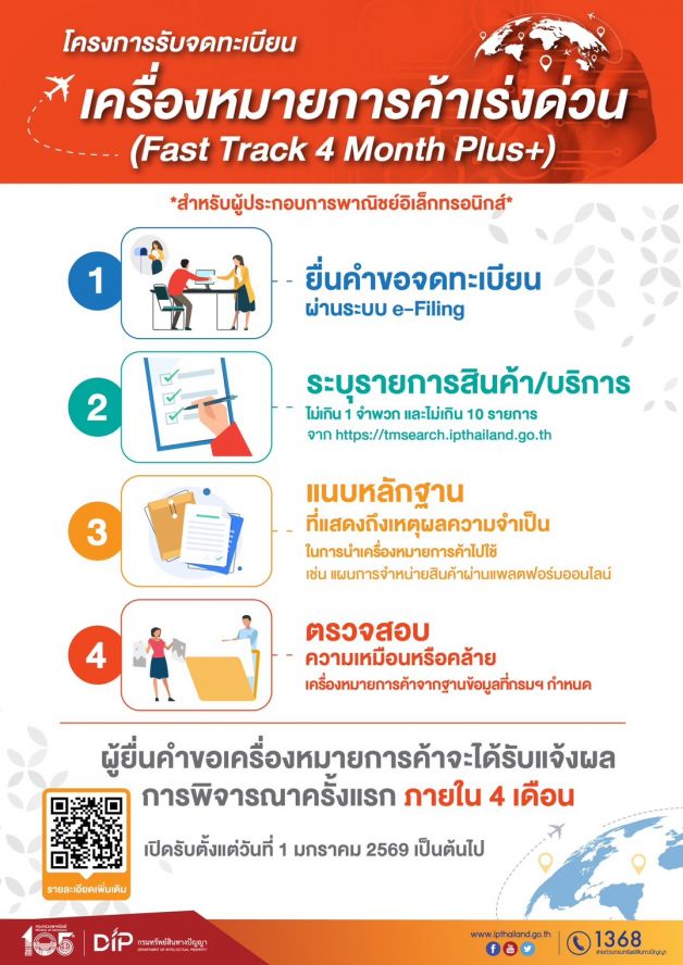 นางอรมน กล่าวเพิ่มเติมว่า ในปี 2569 กรมมุ่งมั่นพัฒนางานบริการจดทะเบียนทรัพย์สินทางปัญญาให้มีประสิทธิภาพ ได้มาตรฐานสากล และตอบสนองความต้องการของผู้ใช้บริการอย่างต่อเนื่อง โดยเฉพาะบริการเร่งรัดการจดทะเบียน Fast Track Plus+ ในสาขาที่ภาคอุตสาหกรรมไทยมีศักยภาพและตอบโจทย์บริบทการค้าในยุคปัจจุบัน ตลอดจนนำเทคโนโลยีสมัยใหม่มาประยุกต์ใช้กับงานบริการประชาชนรูปแบบต่างๆ เพื่ออำนวยความสะดวกแก่ผู้ใช้บริการยิ่งขึ้น ซึ่งผู้สนใจสามารถสอบถามข้อมูลหรือขอรับคำปรึกษาด้านการจดทะเบียนทรัพย์สินทางปัญญาได้ที่ ศูนย์บริการด้านทรัพย์สินทางปัญญาแบบครบวงจร (IP One) ชั้น 3 กรมทรัพย์สินทางปัญญา กระทรวงพาณิชย์ โทรสายด่วน 1368 หรือช่องทางออนไลน์ผ่านเว็บไซต์ www.ipthailand.go.th และ Line Official Account: @dipthailand