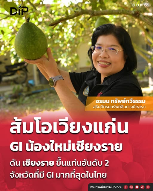 นางอรมน ทรัพย์ทวีธรรม อธิบดีกรมทรัพย์สินทางปัญญา กระทรวงพาณิชย์ เปิดเผยว่า กรมได้ประกาศขึ้นทะเบียนสิ่งบ่งชี้ทางภูมิศาสตร์ (GI) รายการใหม่ คือ ส้มโอเวียงแก่น ผลไม้เด่นแห่งลุ่มน้ำงาว เป็นสินค้า GI ลำดับที่ 9 ของจังหวัดเชียงราย ต่อจากกาแฟดอยตุง กาแฟดอยช้าง สับปะรดนางแล สับปะรดภูแลเชียงราย ชาเชียงราย ข้าวเหนียวเขี้ยวงูเชียงราย ข้าวก่ำล้านนา (ร่วมกับจังหวัดในภาคเหนืออีก 7 จังหวัด) และเครื่องเคลือบเวียงกาหลง โดยมั่นใจว่าจะช่วยยกระดับมูลค่าทางการตลาด เสริมสร้างความเชื่อมั่นให้ผู้บริโภค และสนับสนุนการสร้างรายได้แก่เกษตรกรและชุมชนท้องถิ่นอย่างยั่งยืน