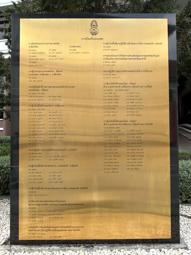 สำหรับรายชื่อทั้งหมดถูกจารึกลงในส่วนของภารกิจป้องกันประเทศทั้งหมด43 ชื่อ แบ่งเป็นห้วงแรกระหว่างวันที่ 24ก.ค.-23 ส.ค.2568 จำนวน 16 นาย จากการสู้รบในพื้นที่จังหวัดอุบลราชธานี ศรีสะเกษ สุรินทร์ และบุรีรัมย์ และห้วงที่ 2 จากการสู้รบในทั้ง 4 พื้นที่อีสานใต้และพื้นที่ จ.สระแก้ว ระหว่างวันที่ 7 ธ.ค.-27 ธ.ค.2568 จำนวน 27 นาย รวมนายทหารที่เสียชีวิตจากการรักษาอธิปไตย ชายแดนไทย-กัมพูชา ทั้งสองครั้ง รวม 43 นาย