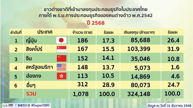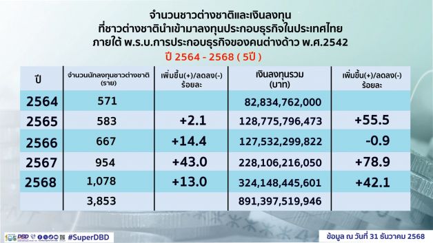 นายพูนพงษ์ นัยนาภากรณ์ อธิบดีกรมพัฒนาธุรกิจการค้า กระทรวงพาณิชย์ ในฐานะเลขานุการคณะกรรมการการประกอบธุรกิจของคนต่างด้าว เปิดเผยว่า ภาพรวมการลงทุนของชาวต่างชาติปี 2568 ภายใต้พระราชบัญญัติการประกอบธุรกิจของคนต่างด้าว พ.ศ. 2542 สูงสุดเป็นประวัติการณ์ในรอบ 5 ปี (2564 - 2568) มูลค่าเงินลงทุนรวมทั้งสิ้น 324,148 ล้านบาท นับเป็นข่าวดีที่นักลงทุนชาวต่างชาติมีความเชื่อมั่นในเสถียรภาพทางเศรษฐกิจ และเห็นว่าประเทศไทยเป็นฐานการผลิตและตลาดที่สำคัญในระดับภูมิภาค โดย *ปี 2564 ลงทุนรวม 8.28 หมื่นล้านบาท *ปี 2565 ลงทุนรวม 1.28 แสนล้านบาท *ปี 2566 ลงทุนรวม 1.27 แสนล้านบาท และ *ปี 2567 ลงทุนรวม 2.28 แสนล้านบาท