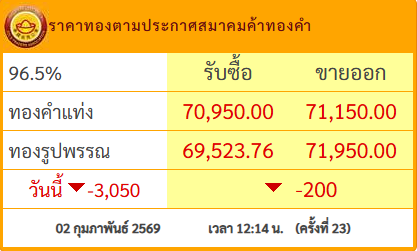 ราคาทองคำวันนี้ (2 ก.พ. 2569) ร่วงลง 3,050 บาท เมื่อเวลา 12.14 น.จากประกาศครั้งที่ 23 เมื่อเทียบกับราคาปิดวานนี้ สมาคมค้าทองคำ รายงาน