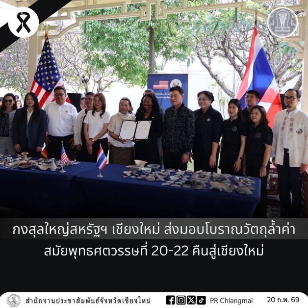 (20 ก.พ.69) ที่สถานกงสุลใหญ่สหรัฐอเมริกาในเชียงใหม่ (แห่งเดิม) ตำบลช้างม่อย อำเภอเมือง จังหวัดเชียงใหม่ นางคีเลีย คัมมินส์ กงสุลใหญ่สหรัฐอเมริกาประจำเชียงใหม่ เป็นประธานกล่าวส่งมอบโบราณวัตถุให้แก่พิพิธภัณฑสถานแห่งชาติเชียงใหม่ โดยมี นางสาวฉัตรลดา สินธุสอน ผู้อำนวยการพิพิธภัณฑสถานแห่งชาติ เชียงใหม่ นายพิชัย เลิศพงศ์อดิศร นายกองค์การบริหารส่วนจังหวัดเชียงใหม่ หัวหน้าส่วนราชการ และหน่วยงานที่เกี่ยวข้องเข้าร่วมพิธี