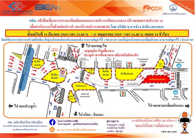 ประชาสัมพันธ์ รฟม. แจ้งปิดเบี่ยงจราจรเพิ่มเติมบนถนนราชปรารภชิดเกาะกลางบริเวณซอยราชปรารภ16 เพื่อดำเนินงานรื้อย้ายท่อประปา สถานีราชปรารภ (OR10) โครงการรถไฟฟ้าสายสีส้ม ช่วงบางขุนนนท์ – ศูนย์วัฒนธรรมแห่งประเทศไทย ตั้งแต่วันที่ 15 มีนาคม 2569 เวลา 22.00 น. – 31 พฤษภาคม 2569 เวลา 24.00 น. ตลอด 24 ชั่วโมง มีผลให้ถนนราชปรารภบริเวณปิดเบี่ยง ฝั่งมุ่งหน้าแยกมักกะสัน (หมอเหล็ง) สามารถสัญจรได้ 1 ช่องจราจร และฝั่งมุ่งหน้าแยกสามเหลี่ยมดินแดง สามารถสัญจรได้ 2 ช่องจราจร โดยประชาชนสามารถเข้า – ออกที่พักอาศัยได้ตามปกติ