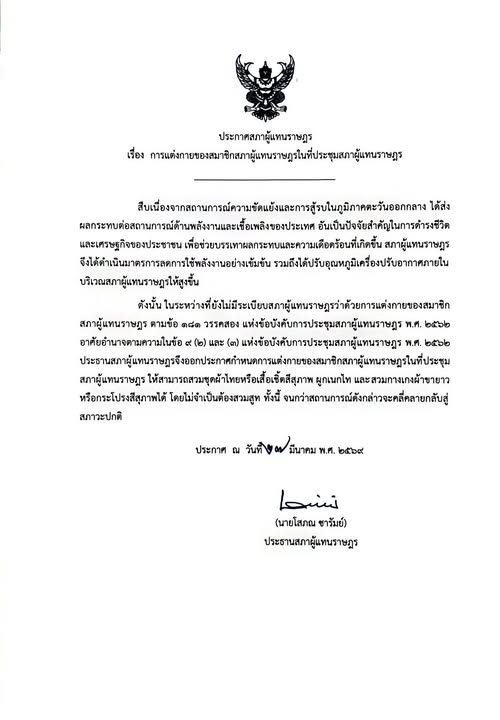 สภาผู้แทนราษฎร ออกประกาศ เรื่องการแต่งกายของสมาชิกสภาผู้แทนราษฎรในที่ประชุมสภาผู้แทนราษฎร สืบเนื่องจากสถานการณ์ความขัดแย้งและการสู้รบในภูมิภาคตะวันออกกลาง ได้ส่งผลกระทบต่อสถานการณ์ด้านพลังงานและเชื้อเพลิงของประเทศ อันเป็นปัจจัยสำคัญในการดำรงชีวิตและเศรษฐกิจของประชาชน เพื่อช่วยบรรเทาผลกระทบและความเดือดร้อนที่เกิดขึ้น สภาผู้แทนราษฎรจึงได้ดำเนินมาตรการลดการใช้พลังงานอย่างเข้มข้น รวมถึงได้ปรับอุณหภูมิเครื่องปรับอากาศภายในบริเวณสภาผู้แทนราษฎรให้สูงขึ้น