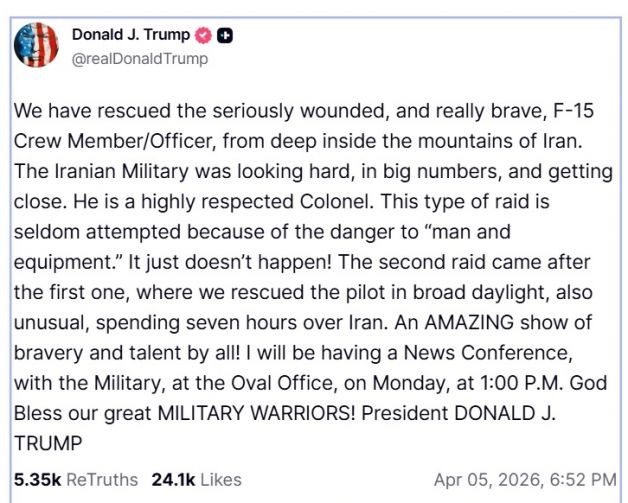 นอกจากนี้ประธานาธิบดีทรัมป์ โพสต์ข้อความเกี่ยวกับการช่วยเหลือนักบินชาวอเมริกัน จากเหตุเครื่องบินรบถูกยิงตกแนวหลังการสู้รบ โดยได้รับบาดเจ็บสาหัสและมีความกล้าหาญมาก ในขณะที่ได้รับการช่วยเหลือจากส่วนลึกของเทือกเขาในอิหร่าน ส่วนนักบินคนที่ 2 ได้รับการช่วยเหลือในเวลาไปกี่ชั่วโมงหลังจากที่เครื่องบินตก