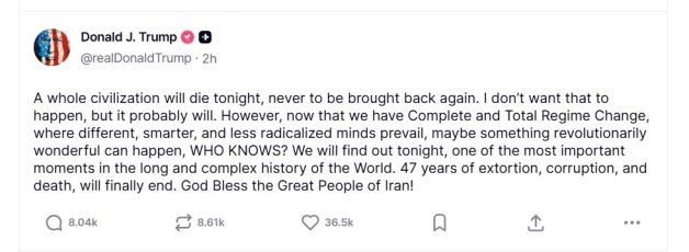 ประธานาธิบดีโดนัลด์ ทรัมป์ ผู้นำสหรัฐฯ ยกระดับการข่มขู่อิหร่านอีกครั้งโดยโพสต์บนโซเชียลมีเดียว่า "อารยธรรมทั้งมวลจะล่มสลายในคืนนี้" หากอิหร่านยังไม่บรรลุข้อตกลงเกี่ยวกับการเปิดช่องแคบฮอร์มุซอีกครั้งภายในเวลา 20.00 น.ตามเวลาฝั่งตะวันออกของสหรัฐฯ