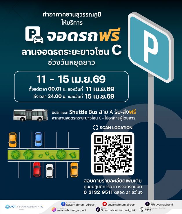 ทั้งนี้ เพื่อเป็นการช่วยบรรเทาภาระค่าใช้จ่ายของประชาชนในช่วงวันหยุดยาว ทสภ. ให้บริการจอดรถฟรี 5 วัน ตั้งแต่เวลา 00.01 ของวันเสาร์ที่ 11 เมษายน 2569 ถึงเวลา 24.00 น. ของวันพุธที่ 15 เมษายน 2569 ณ ลานจอดรถระยะยาวโซน C พร้อมจัดรถรับ - ส่ง ระหว่างลานจอดรถและอาคารผู้โดยสารทุก 15 นาที ตลอด 24 ชั่วโมง