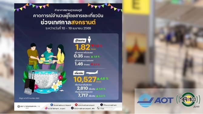 นายกิตติพงศ์ กิตติขจร ผู้อำนวยการท่าอากาศยานสุวรรณภูมิ บริษัท ท่าอากาศยานไทย จำกัด (มหาชน) เปิดเผยว่า ในช่วงเทศกาลสงกรานต์ประจำปี 2569 นี้ ทสภ. คาดการณ์จำนวนผู้โดยสารในภาพรวมที่เดินทางผ่าน ทสภ. ระหว่างวันที่ 10 - 19 เมษายน 2569 (รวม 10 วัน) ประมาณ 1,820,000 คน หรือเฉลี่ยวันละประมาณ 182,000 คน ลดลงจากปีที่ผ่านมาในช่วงเวลาเดียวกันร้อยละ 1.9 สำหรับประมาณการเที่ยวบินในช่วงดังกล่าวคาดว่าจะมีเที่ยวบินประมาณ 11,000 เที่ยวบิน เฉลี่ยวันละ 1,100 เที่ยวบิน เพิ่มขึ้นจากปีที่ผ่านมาในช่วงเวลาเดียวกันร้อยละ 4.6 โดยมีสายการบินขอเพิ่มเที่ยวบินพิเศษและเช่าเหมาลำ (Extra & Charter Flight) จำนวน 9 สายการบิน รวมทั้งสิ้น 130 เที่ยวบิน ซึ่งสายการบินที่ขอเพิ่มเที่ยวบินพิเศษมากที่สุด 3 อันดับแรก คือ สายการบิน AIR MACAU สายการบินบางกอกแอร์เวย์ส และสายการบินไทยเวียตเจ็ทแอร์