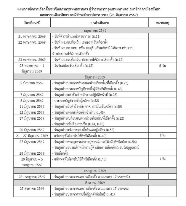 ทั้งนี้ การกำหนดวันรับสมัครรับเลือกตั้งสมาชิกสภากรุงเทพมหานคร ผู้ว่าราชการกรุงเทพมหานคร สมาชิกสภาเมืองพัทยา และนายกเมืองพัทยา ระหว่างวันที่ 28 พฤษภาคม – 1 มิถุนายน 2569 และวันเลือกตั้ง ในวันอาทิตย์ที่ 28 มิถุนายน 2569 เวลา 08.00 – 17.00 น.