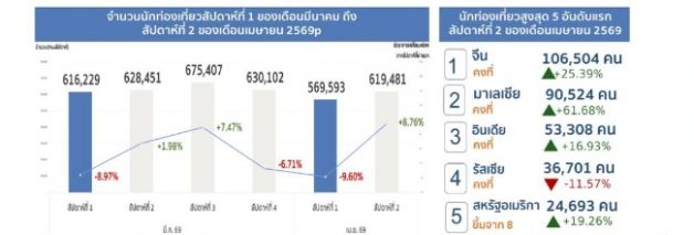 ส่งผลให้ภาพรวมในสัปดาห์ที่ผ่านมา (6 – 12 เมษายน 2569) มีจำนวนนักท่องเที่ยวต่างชาติเดินทางเข้ามาประเทศไทยรวมทั้งสิ้น 619,481 คน เพิ่มขึ้นจากสัปดาห์ก่อนหน้า 49,888 คน หรือร้อยละ 8.76 คิดเป็นจำนวนนักท่องเที่ยวต่างชาติที่เดินทางเข้าประเทศไทยเฉลี่ยวันละ 88,498 คน