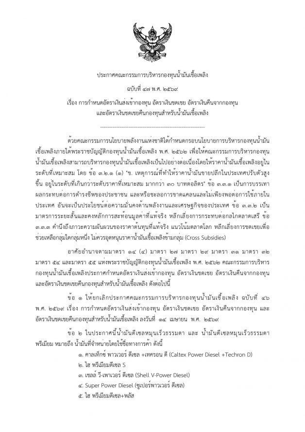 สำนักงานกองทุนน้ำมันเชื้อเพลิง เผยแพร่ประกาศ ประกาศคณะกรรมการบริหารกองทุนน้ำมันเชื้อเพลิง ฉบับที่ 47 มีผลวันนี้ (16 เมษายน 2569)เรื่อง การกำหนดอัตราเงินส่งเข้ากองทุน อัตราเงินชดเชย อัตราเงินคืนจากกองทุนและอัตราเงินชดเชยคืนกองทุนสำหรับน้ำมันเชื้อเพลิง ประกาศ ณ วันที่ 15 เม.ย. 69