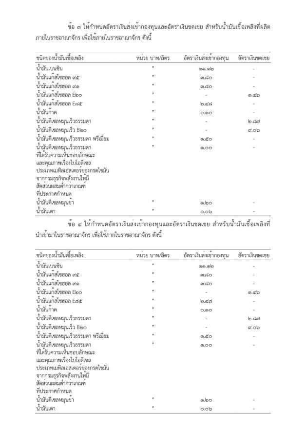 น้ำมันเบนซินอัตราเงินส่งเข้ากองทุน 11.12 บาท/ลิตร โดยไม่มีการชดเชย น้ำมันแก๊สโซฮอล์ 95 และ 91 นำเงินส่งเข้ากองทุน 3.80 บาท/ลิตร ส่วน E20 ชดเชย 1.46 บาท/ลิตร