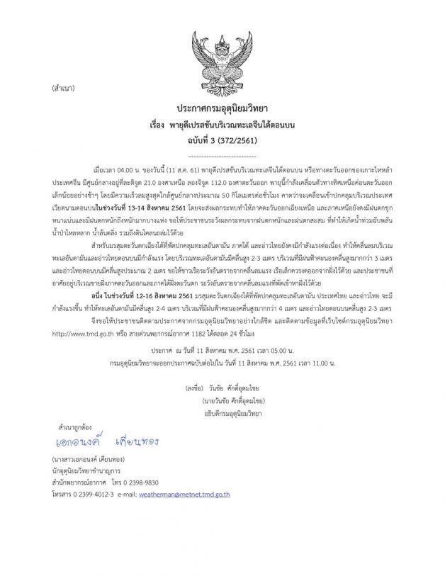 กรมอุตุนิยมวิทยา ประกาศฉบับที่ 3 เวลา 05.00 น. วันที่ 11 สิงหาคม พ.ศ. 2561 เมื่อเวลา 04.00 น.พายุดีเปรสชันบริเวณทะเลจีนใต้ตอนบน หรือทางตะวันออกของเกาะไหหลำ ประเทศจีน มีศูนย์กลางอยู่ที่ละติจูด 21.0 องศาเหนือ ลองจิจูด 112.0 องศาตะวันออก พายุนี้กำลังเคลื่อนตัวทางทิศเหนือค่อนตะวันออกเล็กน้อยอย่างช้าๆ โดยมีความเร็วลมสูงสุดใกล้ศูนย์กลางประมาณ 50 กิโลเมตรต่อชั่วโมง คาดว่า จะเคลื่อนเข้าปกคลุมบริเวณประเทศเวียดนามตอนบนในช่วงวันที่ 13-14 สิงหาคม 2561 โดยจะส่งผลกระทบทำให้ภาคตะวันออกเฉียงเหนือ และภาคเหนือ ยังคงมีฝนตกชุกหนาแน่นและมีฝนตกหนักถึงหนักมากบางแห่ง ขอให้ประชาชนระวังผลกระทบจากฝนตกหนักและฝนตกสะสม ที่ทำให้เกิดน้ำท่วมฉับพลัน น้ำป่าไหลหลาก น้ำล้นตลิ่ง รวมถึงดินโคลนถล่มไว้ด้วย