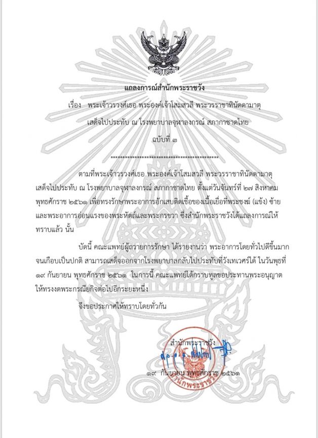 บัดนี้ คณะแพทย์ผู้ถวายการรักษา ได้รายงานว่า พระอาการโดยทั่วไปดีขึ้นมากจนเกือบเป็นปกติ สามารถเสด็จออกจากโรงพยาบาลกลับไปประทับที่วังเทเวศร์ได้ ในวันพุธที่ 19 กันยายน พุทธศักราช 2561 ในการนี้ คณะแพทย์ได้กราบทูลขอประทานพระอนุญาต ให้ทรงงดพระกรณียกิจต่อไปอีกระยะหนึ่ง