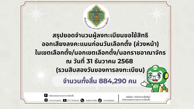 กกต. เผยยอดผู้ลงทะเบียนเลือกตั้งสส.ล่วงหน้าเกือบ 9 แสนคน