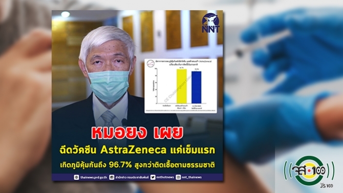 ว่า ได้ศึกษาภูมิต้านทานหลังฉีดวัคซีน AstraZeneca ในคนไทย หลังเข็มแรกเป็นระยะเวลา 1 เดือน จำนวน 61 คน เป็นการรายงานเบื้องต้น ตรวจวัดภูมิต้านทานได้ถึงร้อยละ 96.7 เมื่อเปรียบเทียบกับผู้ป่วยที่หายจากการติดเชื้อเป็นระยะเวลา 4-8 สัปดาห์ ตรวจพบได้ร้อยละ 92.4