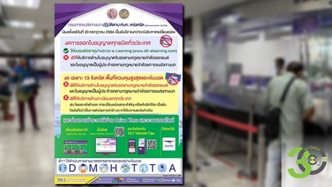 - "งด" ให้บริการด้านใบอนุญาตขับรถตามกฎหมายว่าด้วยรถยนต์ และใบอนุญาตเป็นผู้ประจำรถตามกฎหมายว่าด้วยการขนส่งทางบก ณ สำนักงานขนส่งทุกแห่งทั่วประเทศ ตั้งแต่วันที่ 20 กรกฎาคม 2564 เป็นต้นไป จนกว่าจะมีประกาศยกเลิกสถานการณ์ฉุกเฉินหรือมีประกาศเป็นอย่างอื่น