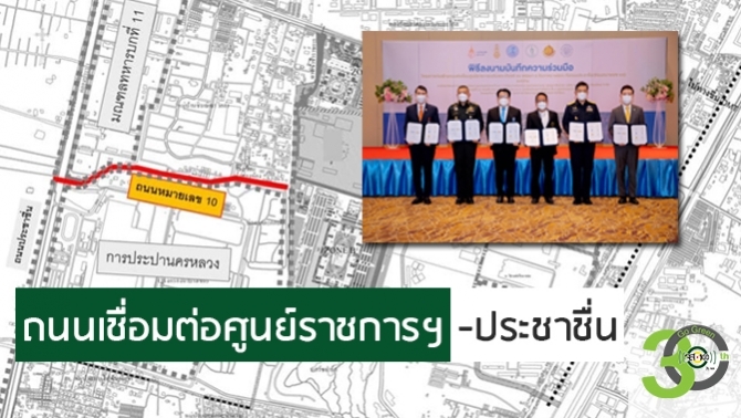 ราชวิทยาลัยจุฬาภรณ์ ร่วมกับ กองทัพบก โดยมณฑลทหารบกที่ ๑๑ การประปานครหลวง กรุงเทพมหานคร กรมธนารักษ์ และ บริษัท ธนารักษ์พัฒนาสินทรัพย์ จำกัด โดย ศาสตราจารย์ นายแพทย์นิธิ มหานนท์ เลขาธิการราชวิทยาลัยจุฬาภรณ์ พร้อมด้วยพลตรี สราวุธ ไชยสิทธิ์ ผู้บัญชาการมณฑลทหารบกที่ ๑๑ นายกวี อารีกุล ผู้ว่าการการประปานครหลวง นายศักดิ์ชัย บุญมา รองผู้ว่าราชการกรุงเทพมหานคร นายประภาศ คงเอียด อธิบดีกรมธนารักษ์ และนายนาฬิกอติภัค แสงสนิท กรรมการผู้จัดการ บริษัท ธนารักษ์พัฒนาสินทรัพย์ จำกัด ร่วมลงนามบันทึกความร่วมมือโครงการก่อสร้างถนนต่อเชื่อมศูนย์ราชการเฉลิมพระเกียรติ ๘๐ พรรษา ๕ ธันวาคม ๒๕๕๐ กับถนนประชาชื่น (ถนนหมายเลข ๑๐) ณ ห้องประชุมวายุภักษ์ ๖ ชั้น ๕ ศูนย์ประชุมวายุภักษ์ โรงแรมเซ็นทรา บายเซ็นทารา ศูนย์ราชการและคอนเวนชันเซ็นเตอร์ แจ้งวัฒนะ กรุงเทพมหานคร