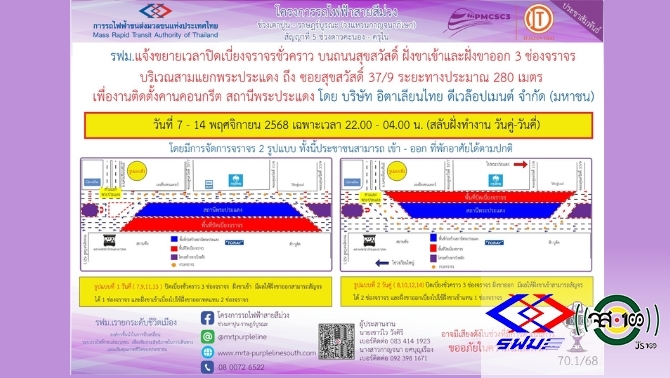 รฟม. แจ้งขยายเวลาปิดเบี่ยงจราจรชั่วคราว บนถนนสุขสวัสดิ์ ฝั่งขาเข้าและขาออก 3 ช่องจราจร บริเวณสามแยกพระประแดง ถึง ซอยสุขสวัสดิ์ 37/9 ระยะทางประมาณ 280 เมตร วันที่ 7 - 14 พฤศจิกายน 2568 เฉพาะเวลา 22.00 - 04.00 น. (สลับฝั่งทำงานวันคู่-วันคี่)