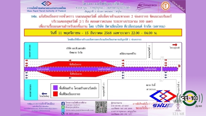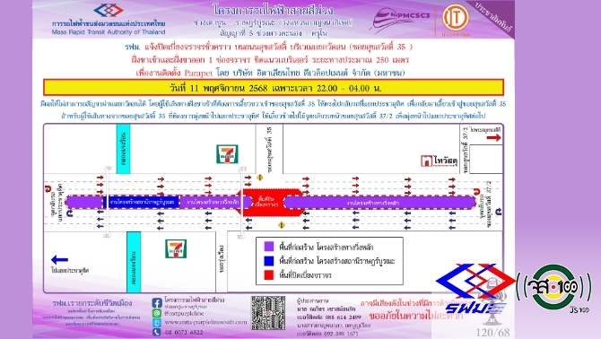 รฟม. แจ้งปิดเบี่ยงจราจรชั่วคราวบนถนนสุขสวัสดิ์ บริเวณแยกวัดสน (ซอยสุขสวัสดิ์ 35) ฝั่งขาเข้าและฝั่งขาออก 1 ช่องจราจร ชิดแนวแบริเออร์ วันที่ 11 พฤศจิกายน 2568 เฉพาะเวลา 22.00 - 04.00 น.
