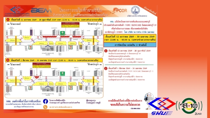 รฟม. แจ้งปิดเบี่ยงการจราจรเพิ่มเติมบนถนนเพชรบุรี บริเวณหน้าห้างสรรพสินค้า TOFU SKINCARE ถึงบริเวณซอยเพชรบุรี 19 ตั้งแต่วันที่ 12 มกราคม 2569 – 30 เมษายน 2569 เวลา 22.00 น. – 05.00 น.