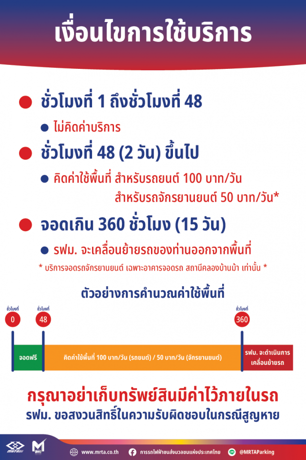 สอบถามรายละเอียดเพิ่มเติมได้ที่ Line ID : @MRTAParking หรือ แอปพลิเคชั่น MRTA Parking หรือ เว็บไซต์ รฟม. www.mrta.co.th และ Call Center รฟม. โทร. 0 2716 4044 “รฟม. ร่วมยกระดับเมือง ด้วยโครงข่ายรถไฟฟ้าขนส่งมวลชนและนวัตกรรม เพื่ออนาคตที่ยั่งยืน”