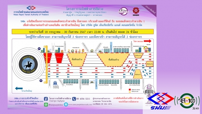 การรถไฟฟ้าขนส่งมวลชนแห่งประเทศไทย (รฟม.) แจ้งว่า บริษัท ยูนิค เอ็นจิเนียริ่ง แอนด์ คอนสตรัคชั่น จำกัด (มหาชน) ผู้รับจ้างงานออกแบบและก่อสร้างอุโมงค์ทางวิ่งและสถานีใต้ดิน โครงการรถไฟฟ้าสายสีม่วง ช่วงเตาปูน - ราษฎร์บูรณะ (วงแหวนกาญจนาภิเษก) สัญญาที่ 4 ช่วงสะพานพุทธ - ดาวคะนอง มีความจำเป็นต้องปิดเบี่ยงจราจรบนถนนสมเด็จพระเจ้าตากสิน ฝั่งขาออก บริเวณห้างเมอร์รี่คิงส์ ถึง ซอยสมเด็จพระเจ้าตากสิน 1 เพื่อดำเนินงานก่อสร้างกำแพงกันดิน สถานีวงเวียนใหญ่ ระหว่างวันที่ 18 กรกฎาคม – 30 กันยายน 2567 เวลา 22.00 น. เป็นต้นไป ตลอด 24 ชั่วโมง โดยผู้ใช้ทางฝั่งขาออกและฝั่งขาเข้า สามารถสัญจรได้ฝั่งละ 2