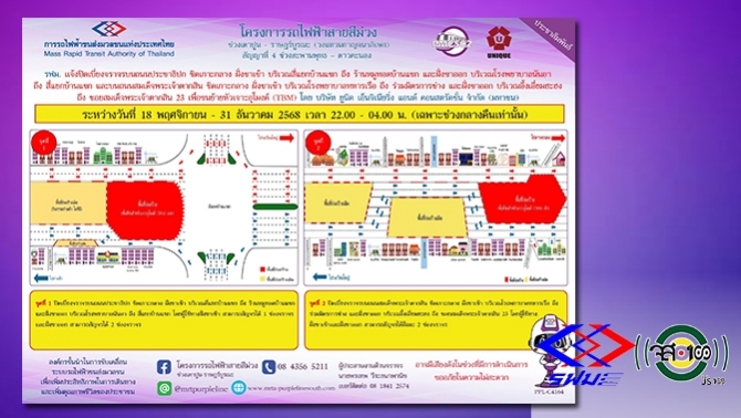 การรถไฟฟ้าขนส่งมวลชนแห่งประเทศไทย (รฟม.) แจ้งว่า บริษัท ซิโน-ไทย เอ็นจีเนียริ่ง แอนด์ คอนสตรัคชั่น จำกัด (มหาชน) ผู้รับจ้างก่อสร้างงานโยธา ของโครงการรถไฟฟ้าสายสีชมพูส่วนต่อขยาย ช่วงสถานีศรีรัช – เมืองทองธานี มีความจำเป็นต้องปิดเบี่ยงจราจร ทุกช่องทาง บนซอยแจ้งวัฒนะ – ปากเกร็ด 39 ฝั่งขาออก มุ่งหน้าถนนแจ้งวัฒนะ ระยะทางประมาณ 100 เมตร ตั้งแต่ วันที่ 14 สิงหาคม 2567 – 31 ตุลาคม 2567 เวลา 22.00 น. ถึงเวลา 04.00 น. (เฉพาะวันที่ปฏิบัติงาน) เพื่อดำเนินการยกติดตั้งชิ้นงาน Guideway Beam ของโครงการรถไฟฟ้าสายสีชมพูส่วนต่อขยาย ช่วงสถานีศรีรัช – เมืองทองธานี