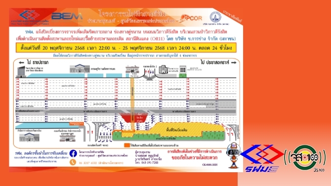 ทั้งนี้ การปิดเบี่ยงจราจรเพื่อดำเนินงานดังกล่าว อาจทำให้ผู้ใช้เส้นทางไม่ได้รับความสะดวกในการเดินทาง และอาจมีเสียงดังรบกวนพื้นที่บริเวณใกล้เคียงในวันเวลาดังกล่าว ดังนั้น หากไม่มีความจำเป็น โปรดหลีกเลี่ยงเส้นทาง และ รฟม. ต้องขออภัยมา ณ โอกาสนี้ โดยผู้ใช้เส้นทางสามารถสอบถามรายละเอียดการเบี่ยงจราจรได้ที่หมายเลข 0 2168 3460 - 68 และติดตามข้อมูลโครงการฯ ได้ที่ Facebook โครงการรถไฟฟ้าสายสีส้ม ช่วงบางขุนนนท์ - ศูนย์วัฒนธรรมแห่งประเทศไทย