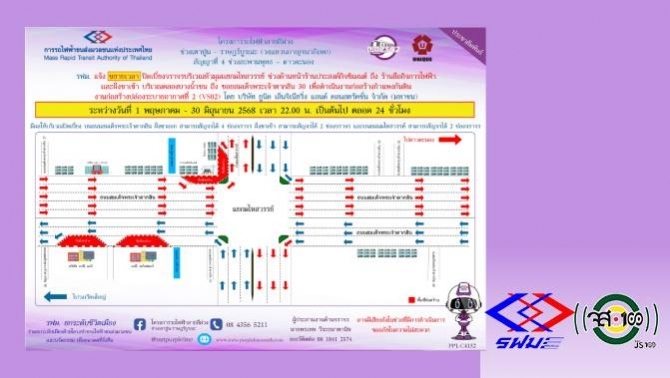 การรถไฟฟ้าขนส่งมวลชนแห่งประเทศไทย (รฟม.) แจ้งว่า บริษัท ยูนิค เอ็นจิเนียริ่ง แอนด์ คอนสตรัคชั่น จำกัด (มหาชน) ผู้รับจ้างงานออกแบบและก่อสร้างอุโมงค์ทางวิ่งและสถานีใต้ดิน โครงการรถไฟฟ้าสายสีม่วง ช่วงเตาปูน - ราษฎร์บูรณะ (วงแหวนกาญจนาภิเษก) สัญญาที่ 4 ช่วงสะพานพุทธ - ดาวคะนอง มีความจำเป็นต้องปิดเบี่ยงจราจรบริเวณหัวมุมแยกมไหสวรรย์ ช่วงด้านหน้าร้านประสงค์กิจซิเมนต์ ถึง ร้านลือกิจการไฟฟ้า และฝั่งขาเข้า บริเวณคลองบางน้ำชน ถึง ซอยสมเด็จพระเจ้าตากสิน 30 เพื่อดำเนินงานก่อสร้างกำแพงกันดิน งานก่อสร้างปล่องระบายอากาศที่ 2 (VS02) ระหว่างวันที่ 1 พฤษภาคม – 30 มิถุนายน 2568 เวลา 22.00 น. เป็นต้นไป ตลอด 24 ชั่วโมง มีผลให้บริเวณปิดเบี่ยง บนถนนสมเด็จพระเจ้าตากสิน ฝั่งขาออก สามารถสัญจรได้ 4 ช่องจราจร ฝั่งขาเข้า สามารถสัญจรได้ 2 ช่องจราจร และบนถนนมไหสวรรย์ สามารถสัญจรได้ 2 ช่องจราจร