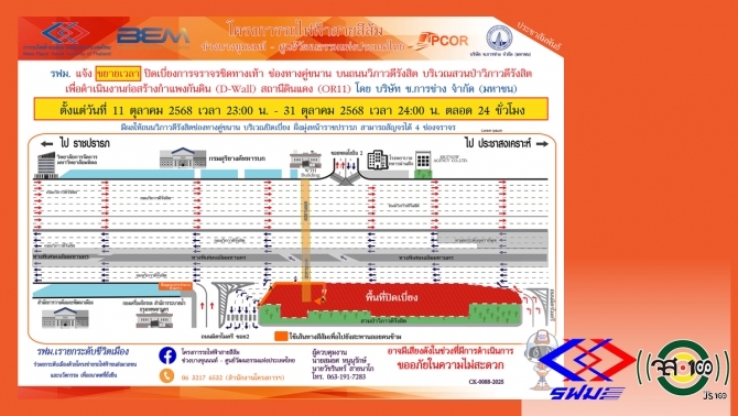 การรถไฟฟ้าขนส่งมวลชนแห่งประเทศไทย (รฟม.) แจ้งว่า บริษัท ช.การช่าง จำกัด (มหาชน) ผู้รับจ้างออกแบบและก่อสร้างอุโมงค์ทางวิ่งและสถานีใต้ดิน โครงการรถไฟฟ้าสายสีส้ม ช่วงบางขุนนนท์ – ศูนย์วัฒนธรรมแห่งประเทศไทย มีความจำเป็นต้องขยายเวลาปิดเบี่ยงการจราจร 4 ช่องจราจร ชิดทางเท้า ช่องทางคู่ขนาน บนถนนวิภาวดีรังสิต บริเวณสวนป่าวิภาวดีรังสิต เพื่อดำเนินงานก่อสร้างกำแพงกันดิน (D-Wall) สถานีดินแดง (OR11) ตั้งแต่วันที่ 11 ตุลาคม 2568 เวลา 23:00 น. – 31 ตุลาคม 2568 เวลา 24:00 น. (ตลอด 24 ชั่วโมง) มีผลให้ถนนวิภาวดีรังสิตช่องทางคู่ขนาน บริเวณปิดเบี่ยง ฝั่งมุ่งหน้าราชปรารภ สามารถสัญจรได้ 4 ช่องจราจร โดยประชาชนสามารถเข้า – ออกที่พักอาศัยได้ตามปกติ