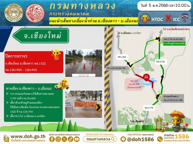 กรมทางหลวงสรุปสถานการณ์ล่าสุด ณ เวลา 10.00 น.(5 ต.ค. 68) พบการจราจรผ่านไม่ได้ในพื้นที่ จ.พิจิตร และ จ.เชียงใหม่ โปรดตรวจสอบเส้นทางก่อนออกเดินทาง
