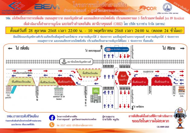 1. วันที่ 28 ตุลาคม 2568 เวลา 22:00 น. – 10 พฤศจิกายน 2568 เวลา 24:00 น. (ตลอด 24 ชั่วโมง)ปิดเบี่ยงการจราจรเพิ่มเติม 2 ช่องจราจร บนถนนสุทธาวาส ถนนจรัญสนิทวงศ์ และถนนเลียบทางรถไฟตลิ่งชัน บริเวณซอยพรานนก 5 ถึงบริเวณอพาร์ทเม้นท์ Jen 89 Resident มีผลให้ถนนจรัญสนิทวงศ์บริเวณปิดเบี่ยงฝั่งมุ่งหน้าแยกไฟฉาย สามารถสัญจรได้ 2 ช่องจราจร ถนนจรัญสนิทวงศ์ฝั่งมุ่งหน้าแยกบางขุนนนท์ สามารถสัญจรได้ 3 ช่องจราจร ส่วนถนนสุทธาวาส และถนนเลียบทางรถไฟตลิ่งชัน บริเวณปิดเบี่ยงสามารถสัญจรได้ฝั่งละ 1 ช่องจราจร ทั้งสองฝั่ง โดยประชาชนสามารถเข้า – ออกที่พักอาศัยได้ตามปกติ