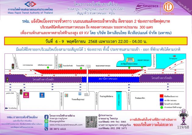 การรถไฟฟ้าขนส่งมวลชนแห่งประเทศไทย (รฟม.) แจ้งว่า บริษัท อิตาเลียนไทย ดีเวล๊อปเมนต์ จำกัด (มหาชน) ผู้รับจ้างงานก่อสร้างทางวิ่งและสถานียกระดับ อาคารจอดรถไฟฟ้าและอาคารจอดแล้วจร โครงการรถไฟฟ้าสายสีม่วง ช่วงเตาปูน - ราษฎร์บูรณะ (วงแหวนกาญจนาภิเษก) สัญญาที่ 5 ช่วงดาวคะนอง - ครุใน มีความจำเป็นต้องปิดเบี่ยงจราจรชั่วคราว บนถนนสมเด็จพระเจ้าตากสิน ฝั่งขาออก 2 ช่องจราจร ชิดฟุตบาท บริเวณคลินิคทันตกรรมดาวคะนอง ถึง คลองดาวคะนอง ระยะทางประมาณ 300 เมตร เพื่องานหักเสาและพาดสายไฟฟ้าแรงสูง 69 kV ในวันที่ 6 - 9 พฤศจิกายน 2568 เฉพาะเวลา 22.00 - 04.00 น. โดยมีผลให้ฝั่งขาออกบริเวณปิดเบี่ยงสามารถสัญจรได้ 1 ช่องจราจร  ทั้งนี้ ประชาชนสามารถเข้า - ออก ที่พักอาศัยได้ตามปกติ